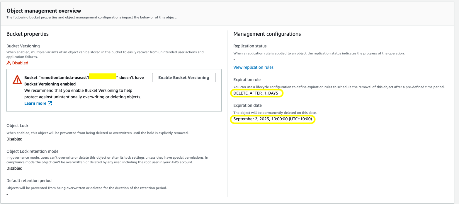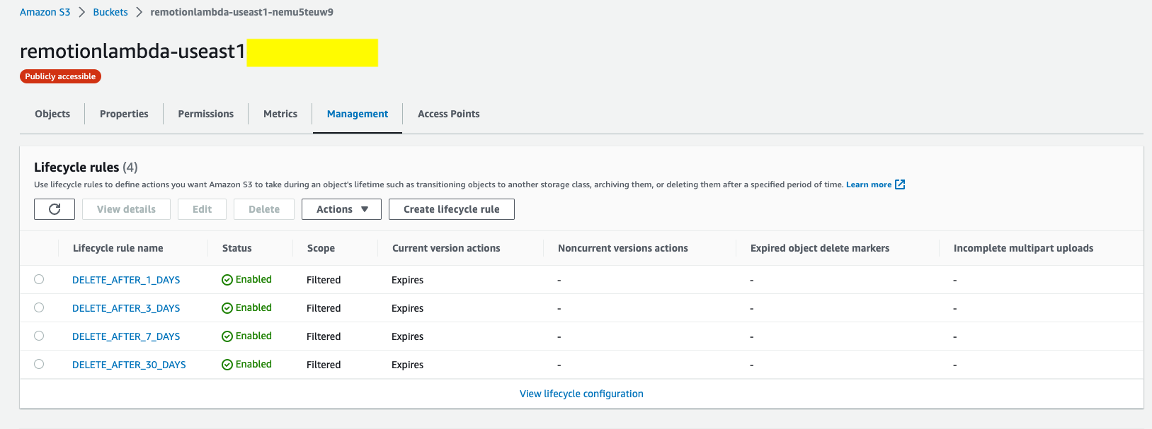 By applying the AWS Lifecycle rules, we are instructing AWS S3 to delete files based on their prefixes. When deleteAfter is defined with a value of "1-day", the renderId will be prefixed with 1-day, and the S3 key will start with renders/1-day-*, to which the deletion rule will be applied.